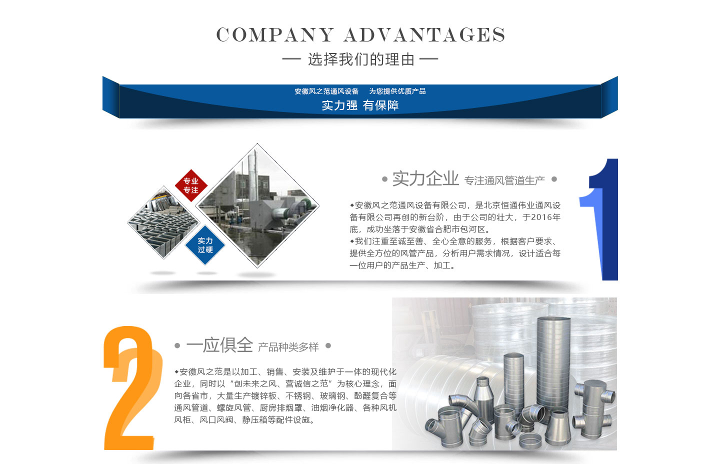 安徽風(fēng)之范通風(fēng)設(shè)備有限公司,是北京恒通偉業(yè)通風(fēng)設(shè)備有限公司再創(chuàng)的新臺(tái)階,多年來,公司員工憑著“誠(chéng)信敬業(yè)、團(tuán)結(jié)拼搏、勇于開拓、務(wù)實(shí)進(jìn)取”的企業(yè)精神,先后承接了多項(xiàng)重點(diǎn)工程項(xiàng)目,使公司健康穩(wěn)步發(fā)展。現(xiàn)由于公司的壯大,業(yè)務(wù)的拓展,又于2016年底,成功坐落于安徽省合肥市包河區(qū)。本公司生產(chǎn)設(shè)備精良,技術(shù)力量雄厚,質(zhì)保體系完善!讓用戶體驗(yàn)到,貼心的服務(wù),無憂的售后!風(fēng)之范是以加工、銷售、安裝及維護(hù)于一體的現(xiàn)代化企業(yè),同時(shí)以“創(chuàng)未來之風(fēng)、營(yíng)誠(chéng)信之范”為核心理念,面向全國(guó)各省市,大量生產(chǎn)鍍鋅板、不銹鋼、玻璃鋼、酚醛復(fù)合等通風(fēng)管道、螺旋風(fēng)管、廚房排煙罩、油煙凈化器、各種風(fēng)機(jī)風(fēng)柜、風(fēng)口風(fēng)閥、靜壓箱等配件設(shè)施。廣泛承接商場(chǎng)、工廠、酒店、寫字樓、地下室等,消防排煙工程、除塵凈化工程、室內(nèi)通風(fēng)工程、暖通空調(diào)工程、廚房排煙凈化工程。我們力求上進(jìn),追求,歡迎各界人士技術(shù)指導(dǎo),經(jīng)濟(jì)合作,共創(chuàng)美好明天!